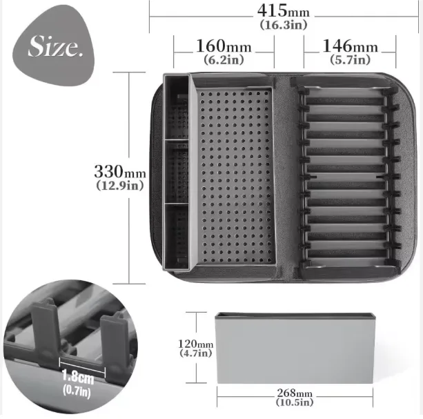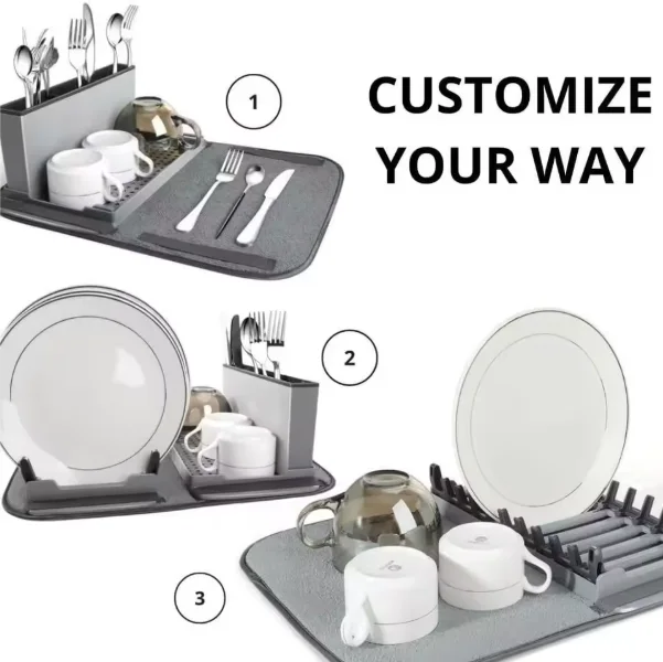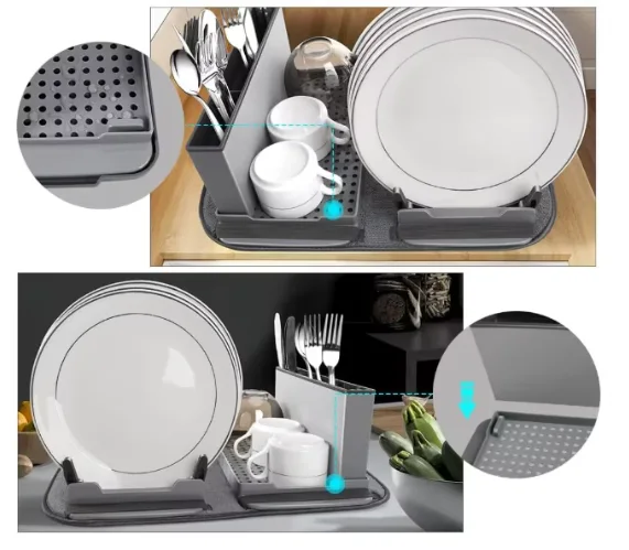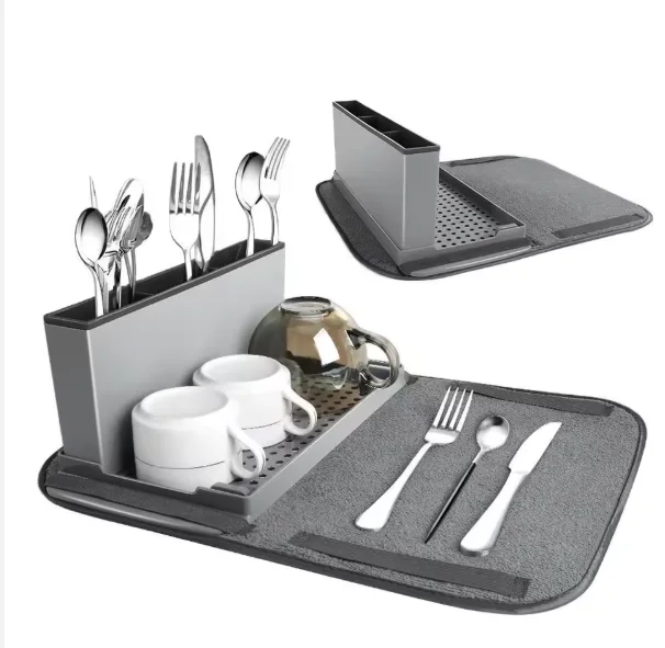 منظّم ذكي يجمع بين سجادة ماصّة للماء + حامل صحون وأكواب + منظم أدوات في قطعة واحدة.